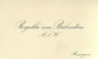 Ab 1909 war er Mitglied des Preußischen Herrenhauses in Berlin. Bieberstein war 1909 in Königsberg Gründungsmitglied des Familienverbandes Rogalla von Bieberstein e. V. Seine Familie beschreibt ihn als „vornehmen Grundherren, reizenden Hausherrn und etwas sarkastisch“ und seine Ehefrau Olga als „Herrscherin in ihrem Reich, glänzende Repräsentantin und mit sprühendem Humor“.