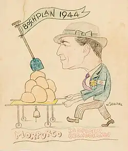jüdischer Zwangsarbeiter mit Davidstern und Rotkreuz-Armbinde schiebt eine Bahre mit Steinen im Amsterdamse Bos; Sammlung Joods Museum