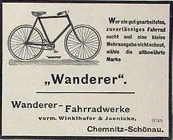 Die Anfänge von Wanderer gehen bis in das Jahr 1885 zurück. In diesem Jahr gründeten Johann Baptist Winklhofer und Richard Adolf Jaenicke in Chemnitz die am 26. Februar 1885 ins Handelsregister eingetragene Gesellschaft „Chemnitzer Velociped-Depôt Winklhofer & Jaenicke“ zum Verkauf und zur Reparatur von Fahrrädern. Die Fahrräder bezogen sie zunächst aus England.[4] Wenig später fertigten sie bereits einige Hochräder selbst an und ab dem Winter 1885/1886 wurde eine fabrikmäßige Herstellung vorbereitet. Winklhofer und Jaenicke firmierten daher ab 4. Januar 1887 als „Chemnitzer Veloziped-Fabrik Winklhofer & Jaenicke“.
