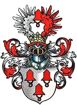 Das Wappen zeigt in Silber drei (2:1) rote Beckenhauben (Sturmhauben oder Kesselhauben) mit roten Bändern. Auf dem gekrönten Helm mit rot-silbernen Decken eine rote Beckenhaube zwischen einem rechts silbernen, links roten offenen Flug.