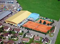 ![]() Drohnenaufnahme auf Höhe Bahnhof Siebnen-Wangen mit Blick Richtung Dorfzentrum.