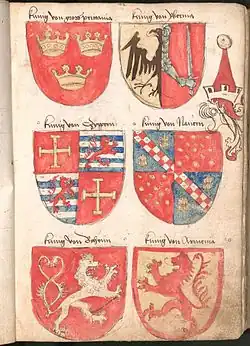 Sein Sohn, Johann der Blinde, König von Böhmen, übernahm den roten golden gekrönten Löwe, nicht aber die vielen blauen Balken. Sein geviertes Wappen mit dem Böhmischen Löwen und dem Luxemburger Löwe ist im „Wapenboek van Beyeren“ (1400) zu sehn.