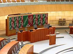 - „Das Landeswappen zeigt in gespaltenem Schild vorne in grünem Feld einen linksschrägen silbernen Wellenbalken, hinten im roten Feld ein springendes silbernes Ross und unten in einer eingebogenen silbernen Spitze eine rote Rose mit goldenen Butzen und goldenen Kelchblättern.“