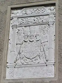 Der (heraldisch) rechte Helm trägt einen spitzen Herzogshut und einen kleinen Pfauenfederbusch.