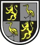 „Oben eckig - unten abgerundet, zwei goldene aufgerichtete Löwen mit goldener Krone und ausgeschlagener roter Zunge auf schwarzem Grund; auf den beiden anderen diagonal gegenüberliegenden Feldern zwei schreitende Kraniche, ebenfalls goldfarben, aber auf silbernem Grund.“