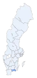 In Blau ein rotbewehrter silberner Löwe. Symbol: Es existieren mehrere Theorien über die Herkunft des Löwen. Nach der einen Theorie geht er auf Herzog Bengt Algotsson im 14. Jahrhundert zurück, nach der anderen auf das Königswappen von Karl X Gustav, den Eroberer der Provinz. |