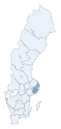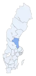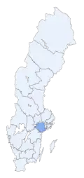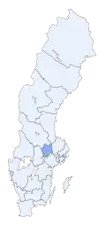 In Gold ein rotbewehrter schwarzer Greif. Symbol: Der Greif aus diesem Wappen findet sich auch im Wappen des Stockholms län. Das Wappen wurde der Provinz im Jahr 1560 bei der Bestattung König Gustav I. verliehen und geht zurück auf den Adeligen des 14. Jahrhunderts, Bo Jonsson, dessen Familie einen Greifen als Familienwappen führte und das Schloss Gripsholm begründete (grip = Greif + holm = Insel). |