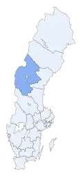 Das Wappen ist geteilt und unten gespalten. Oben in Blau ein laufender rotbewehrter silberner Hirsch mit bestreuten goldenen Sternen umgeben; Unten und vorn in Silber ein roter barfüßiger wilder Mann dem Betrachter zugewandt mit grünem Schurz und Haaren eine goldene Keule in der rechten Hand über die rechte Schulter haltend und hinten in Blau drei rotbeflosste silberne Lachse pfahlgestellt, der mittlere gegengewendet. Symbol: Das Wappen von Västerbotten (Rentier), Lappland (wilder Mann) und Ångermanland (Lachs). |