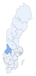 Das Wappen ist gespalten. Vorn in Silber ein rotbewehrter blauer Adler und hinten in Silber ein blauer Dreiberg, aus dem drei rote Flammen emporzüngeln Im roten Schildhaupt zwei schräggekreuzte goldene Pfeilen mit goldenen Befiederungen und silbernen Spitzen, die von vier silbernen Rosen bewinkelt werden. Symbol: Wappen von Värmland (Adler), Västmanland (Berge mit Flammen) und Närke (gekreuzte Pfeile). |