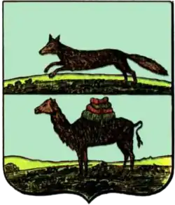 | Wappenschild | Wappen horizontal geteilt. Oben Ziegelmauermuster in silber, unten grün. Davor ein goldenes Kamel mit Waren |