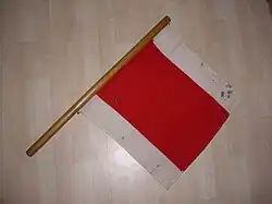 Im Bereich der Bahn ist dies eine kleine weiße Flagge mit einem roten, manchmal auch orangen breiten Streifen in der Mitte. Die Flaggen sind insbesondere auf Rangierbahnhöfen oder bei Schrankenwärterposten und auf Stellwerken anzutreffen. Mit ihnen können die Schutzsignale Sh 2 (früher Wärterhaltsignal – „Schutzhalt“) und Sh 3 (Kreissignal – „Sofort halten“) gegeben werden, um Züge anzuhalten. Schrankenposten können mit ihnen den Bahnübergang sichern wenn die manuelle Schrankenanlage versagt. Auch elektrische Bahnübergänge werden bei Ausfall kurzfristig mit Posten (ggf. Zugpersonal) mit Warnflagge gesichert (§ 19 StVO).