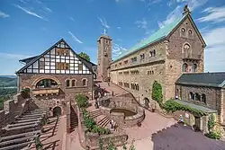 Die Wartburg erhebt sich auf einem schmalen, schroffen Felsgrat etwa 220 m über der Stadt Eisenach. Von ihr aus kann man unter anderem den 17 km nahen Großen Inselsberg im Südosten, die 58 km entfernte Wasserkuppe im Südsüdwesten, und den 95 km entfernten Brocken im Norden erblicken.[32] Sie ist eine typische Abschnittsburg, die ursprünglich aus vier Abschnitten bestand, von denen heute nur noch die Vor- und die Hauptburg erhalten sind. Die größten und für den Baukörper nicht immer vorteilhaften Veränderungen erfuhr die Wartburg im 19. Jahrhundert, als die Restaurierung der Burg auf Goethes Initiative hin im damaligen Gedankengut des Historismus und des wieder erstarkten Nationalismus des deutschen Kaiserreiches erfolgte.