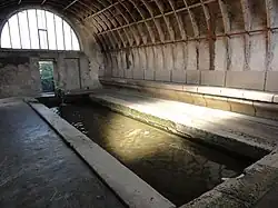 An beiden Längsseiten sind je zehn Plätze für die Wäscherinnen vorhanden, die Steinbänke dienten ihnen zum Ausbreiten der Leintücher.
