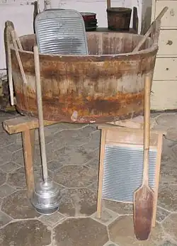 Die Prozedur des Waschens in der Waschküche benötigte weitere Utensilien wie Bleuel (hölzerne Handpaddel) oder rund einen halben Meter lange hölzerne Wäschezangen, mit denen die oft kochend heiße Wäsche aus dem Bottich gezogen werden konnte, Schmierseife, Bürsten, mit denen die Wäsche saubergeschrubbt wurde, ein Waschbrett, um besonders verschmutzte Textilien mechanisch zu reinigen sowie diverse Zinkwannen oder Holzbottiche zum Spülen der Textilien. Mit entsprechenden Holzböcken als Untersatz konnten die Wannen mit Waschwasser auf eine angenehme Arbeitshöhe gebracht werden. Da das Aufheizen des Waschwassers längere Zeit benötigte, lag die Dauer einer Gesamtwäsche bei einem Tag. Wenn mehrere Familien sich eine Waschküche teilen mussten, wurden die Tage der Woche festgelegt, an denen eine bestimmte Familie Waschtag hatte.