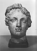 Die gerade Stirn geht absatzlos in den flachen Nasenrücken über, so dass Stirn und Nase eine gerade Linie bilden. Die scharf gezogenen Augenbrauen münden in einem perfekten Bogen nahtlos in die Nasenwurzel. Die Nase ist lang und gleichmäßig schmal und endet in ausgeprägten Nasenflügeln. Der schmale Mund wird gekennzeichnet durch geschürzte volle Lippen, eine kurze Oberlippe mit markant geschwungenen Flügeln, einen leicht geöffneten Mundspalt und deutliche, hochgezogene Mundwinkel. Das volle, hochsitzende Kinn ist schmal und plastisch gewölbt und ragt nicht über die Flucht der Lippen heraus. Die großen, fast mandelförmigen Augen liegen tief in der Augenhöhle. Da die Pupillenbohrungen fehlen, erscheint der Blick unbestimmt und verschleiert. Die wohlgeformten Wangen mit leicht vortretendem Jochbein laufen im ovalen Bogen zum Kinn herab. Der Haarkranz gibt die Ohren mit ihren breiten Muscheln und freien Ohrläppchen nur zur Hälfte dem Blick frei.