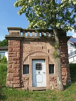 Der Quaderbau aus Rotsandstein ist mit der Jahreszahl 1911 bezeichnet. Die vorstehenden Ecken sind bossiert und auf dem Dach ist eine schmückende Balustrade angebracht.