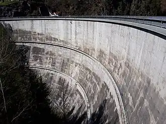 Am Speichersee Wangen kann das Wasser aus dem Zuleitungs-Stollen über eine Bogenbrücke über den Stausee und damit an diesem vorbei geleitet werden.
