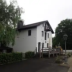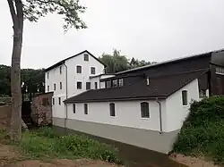 - dem zweigeschossigen giebelständigen verputzten Mühlengebäude von 1894 (Inschrift) mit Satteldach, segmentbogigen Öffnungen sowie mittig und übereinander zwei Ladeluken (die obere mit Balkon), ferner in die Fassade eingelassen Inschrifttafeln von 1630, 1704 und 1989 – die Mühle war noch bis 1960 in Betrieb und wurde 1984 umgebaut und saniert,