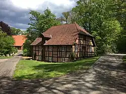 - dem eingeschossigen giebelständigen Wohn- und Wirtschaftsgebäude von um 1810 in Fachwerk mit Steinausfachungen, Krüppelwalmdach, Uhlenloch, später als Stall umgenutzt,[4]