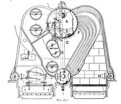 Die Konstruktion ergab eine besonders große Heizfläche. Der Preis dafür war ein dichtes Geflecht von Rohren, wobei jede der zahlreichen Rohrreihen in eine andere und komplexe Form gebogen war. Die Rohrenden führten senkrecht in die zylindrischen Trommeln, um eine gute Abdichtung zu gewährleisten. Der für all diese Rohre benötigte Raum füllte die gesamte untere Hälfte der Dampftrommel aus, so dass sowohl eine große Trommel als auch ein separater Dampfdom zum Auffangen des trockenen Dampfes erforderlich waren. Der äußere Kesselmantel trat an einem Ende in den Rauchabzug ein und umschloss in der Regel diese Kuppel. Die Enden der Trommeln ragten als halbkugelförmige Kuppeln aus dem Gehäuse heraus. Kalte Fallrohre außerhalb des Gehäuses verbanden diese Trommeln und ermöglichten den Rücklauf des kalten Wassers.[12]