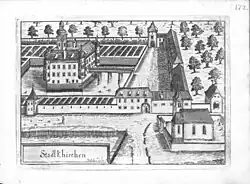 Wie der Kupferstich von Georg Matthäus Vischer von 1674 zeigt, war Stadelkirchen ein dreigeschoßiges Gebäude mit vier vorkragenden Zwiebeltürmen auf den Seiten sowie einen das Gebäude überragenden Mittelturm. Außerhalb des Teiches war das Schloss mit einer Mauer und teilweise mit Wirtschaftsgebäuden umgeben. Die Zugänge waren mit wehrhaften Türmen geschützt. Innerhalb der Anlage sind Beete erkennbar. Das Schloss war naturgemäß über eine Brücke erreichbar. Die Kirche stand außerhalb der Anlage und war ebenfalls mit einer Mauer eingefriedet.
