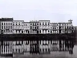 | Das historische Foto zeigt die am Schwanenspiegel befindlichen Stadtpalais aus der Gründerzeit an der Wasserstraße (um 1873). Von links: Wasserstr. 12, 11, 10, 9, 8, 7 und 6. | |