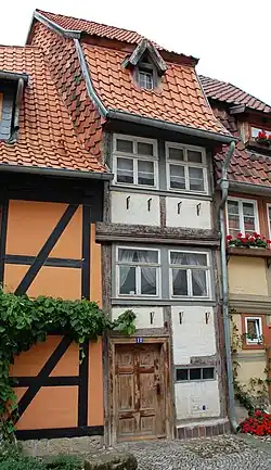 Das sehr schmale, nur drei Gebinde breite Fachwerkhaus entstand in der Zeit um 1740. Bedeckt ist das zweigeschossige Haus mit einem Mansarddach. Im unteren Stockwerk befindet sich ein Zwischengeschoss. Das obere Geschoss kragt etwas über. Die Fassade ist mit einer profilierten Schwelle und Zierausfachungen verziert.