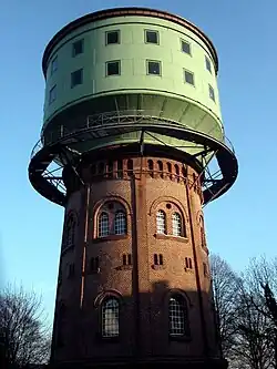 Der dreigeschossige runde Wasserturm ist aus Ziegelsteinen gemauert, auf dem der sichtbare Wasserbehälter aus Stahlblech mit 1000 Kubikmeter Volumen ruht. Der Turmschaft schließt mit einem Rundbogenfries im Stil des Historismus ab, der nach dem Intze-Prinzip erbaute Wassertank lässt jedoch bereits einen technischen Funktionalismus erkennen.