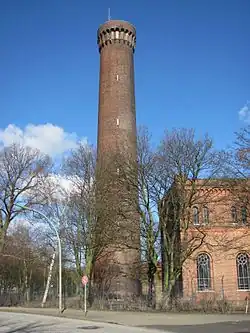 Der 64 Meter hohe Turm wurde für die Stadtwasserkunst errichtet. Er ist kein Bauwerk für einen Hochbehälter, wie die meisten Wassertürme, sondern diente der Druckregulierung nach dem Prinzip der kommunizierenden Röhren mit einer Steige- und einer Fallleitung. Die Verteilung des Wassers erfolgte mittels dampfbetriebener Pumpen.[1] Damit die Leitungen im Winter nicht einfroren, wurden die Abgase des Pumphauses über einen Schornstein im Inneren des Turmes abgeleitet. Der Turm wurde 1903 außer Dienst gestellt. 2024 wurden 2,65 Millionen Euro in die Instandsetzung investiert.[2] Das Bauwerk steht unter Denkmalschutz. Der Wasserturm ist heute das Wahrzeichen des Stadtteils. Das Gelände rund um den Turm wird von den Hamburger Wasserwerken als Museum (das Wasserforum) und als Zentrale der Wasserwerke genutzt.