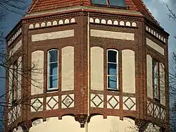 Der 34,2 Meter hohe Wasserturm hat einen zylindrischen Schaft, während die Außenwand in der Behälterzone achtseitig ist. Die Erdgeschossfassade zeigt Sichtmauerwerk in rotem Backstein, darüber sind die Wände hell verputzt. Im Behälterbereich ist die Fassade durch den Wechsel von Backstein- und Putzflächen gegliedert. Ein ebenfalls achtseitiges, mit roten Pfannen gedecktes Zeltdach schließt den Bau nach oben ab.