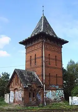 Der Turm entstand in den 1890er Jahren in gotisierendem Stil aus gelblichem Klinkermauerwerk mit dunklen gleichfalls aus Klinkern bestehenden Bändern. Bekrönt wird der dreigeschossige Turm von einem weit auskragenden, pyramidenförmigen Spitzhelm. An den Seiten befinden sich Schlitzfenster. An der südlichen Seite ist ein kleines Bedienhäuschen vorgelagert.