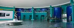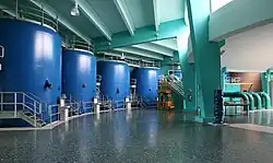 Die erste Stufe stellt die Uferfiltration dar. Zweite Stufe die Oxidation durch Ozon: 0,5 g/m³, Ozonerzeugung aus Sauerstoff. Stufe drei die Voraktivierung durch Aktivkohlefiltration in geschlossener Bauweise, Körnung: 1,5 – 2,5 mm, Fläche: 20 m², Höhe: 1,5 m, Durchsatz: 200 m³/h. Stufe vier die Aktivkohlefiltration in geschlossener Bauweise, Körnung: 0,8 – 2,4 mm, Fläche: 20 m², Höhe: 2,5 m, Durchsatz: 200 m³/h. (Früher als Stufe 5: die Desinfektion mit Chlordioxid: 0,05 g/m³.) Und abschließende die Stufe fünf: Inhibitoren mit Phosphat: 1 g/m³ (früher auch mit Silikat: 1 g/m³.)(Stand 2016).[1][2]