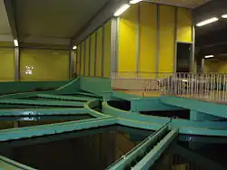 Nachdem das Wasser die Accelatoren verlassen hat, wird ihm Kalkhydrat zugegeben. In der Filterhalle wird es über offenen Filterkies geführt. Dabei werden Reste von Huminstoffen und Eisen entfernt. Durch Mikroorganismen wird Ammonium zu Nitrat gewandelt. Mangan wird abgeschieden. Die Reinigung ist abgeschlossen.