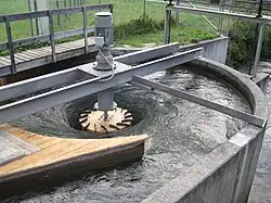 Ein Wasserwirbelkraftwerk, auch Gravitationswasserwirbelkraftwerk (GWWK) genannt, ist ein Kleinwasserkraftwerk, das zur Erzeugung von Energie aus Wasserkraft ab einem Durchfluss von 500 bis 1000 Litern Wasser pro Sekunde bei kleinen Höhendifferenzen von 0,5 bis 3 Metern Gefälle[1][2] geeignet ist. Die Technik beruht auf einem (runden) Becken mit einem zentralen Abfluss nach unten. Über dem Abfluss bildet sich ein stabiler Wasserwirbel aus, der eine spezielle langsam drehende Wasserturbine antreibt.[1] Wasserwirbelkraftwerke weisen geringere Wirkungsgrade als konventionelle Kleinwasserkraftwerke auf, sind jedoch fischgängig.