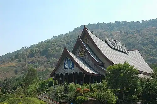 Die weitläufige Tempelanlage, die sich an bewaldete Hügel schmiegt, wird von einem eindrucksvollen Sala (Thai: ศาลาเฉลิมพระเกียรติ), einer Ehrenhalle in nordthailändisch-laotischem Stil dominiert – sie ist hier ausdrücklich als Sala, nicht aber als Bot oder Wihan bezeichnet, wiewohl es sich nicht um einen Pavillon, sondern um das zentrale und heiligste Tempelgebäude handelt. In seinem Inneren zeigt der große, hallenartige Raum unverhohlen eine simple, über einem mit Marmorplatten belegten Zementboden errichtete Metallkonstruktion mit zum überwiegenden Teil nicht verzierten, sondern offenliegenden Wellblechverkleidungen (siehe das Foto). Die rechteckige Halle überspannt einen Raum von etwa 40 mal 80 Metern, umschließt also rund 3.200 Quadratmeter und bietet damit Raum für bis zu 2.000 Pilger. Mit dem Bau der hallenartigen Sala wurde im Jahre 1996 begonnen; das Tempelgebäude konnte 2007 anlässlich des 80sten Geburtstags von König Bhumibol (Rama IX.) feierlich eröffnet werden. Die aufwändigen Bauarbeiten (Gebäude und Buddhafigur) sollen um die 60 Millionen Baht betragen haben; Königin Sirikit beteiligte sich daran mit zwei Millionen Baht aus ihrer Privatschatulle.