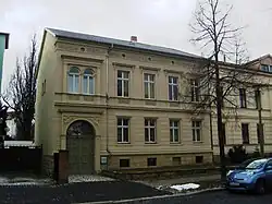 Der verputzte Massivbau entstand in spätklassizistischem Stil in der zweiten Hälfte des 19. Jahrhunderts. Die Fassade ist reich mit Ornamenten verziert. Am als rundbogiges Portal gestalteten Hauseingang befinden sich aus Sandstein gefertigte Zwickelfiguren. Das Oberlicht des Portals ist mit schmalen Sprossen gegliedert.