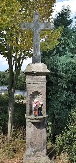 Die Denkmalakte beschreibt das Kreuz mit: „Errichtet 1752, Kreuz mit Korpus auf dreiseitigem Sockel, Sandstein, mit Muschelnische“.
