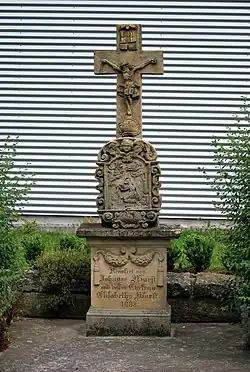Das Wegkreuz (Bildstock Nr: 281007) aus Stein mit Korpus und Relief Christus am Ölberg auf verziertem Sockel trägt folgende Inschrift: „Renofirt von Johannes Wuest und dessen Ehefrau Elisabetha Wuest 1892“. Im Medaillon unter dem Kreuz steht: „Es ist vollbracht“.