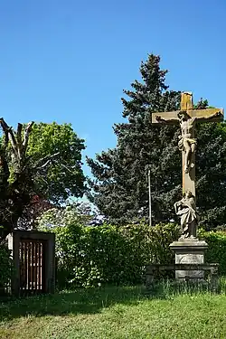 Das 500 cm hohe Wegkreuz besteht aus gelbem Sandstein und entstand im Jahr 1730.