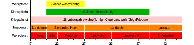 Der Eintritt in die Streitkräfte war zu Quartalsbeginn möglich. Die Dienstpflicht dauerte 7 Jahre lang, vom 21. bis zum 27. Lebensjahr. Dieser Zeitraum wurde in 3 Jahre aktiven Dienst und 4 Jahre Reserve aufgeteilt, bez. später für die Infanterie 2 Aktiv und 5 Jahre Reserve. Die Rekrutierung erfolgte immer zum Oktober des jeweiligen Jahres. Der aktive Wehrdienst betrug somit 2 bzw. 3 Jahre, musste aber innerhalb der Wehrpflicht geleistet werden, wenn der betreffende sich nicht zuvor freiwillig früher zum Wehrdienst gemeldet hatte. Die Reserveeinheiten wurden nur im Kriegsfall gebildet. Vom 1. Januar eines Kalenderjahres an, wurden deutsche Männer, die das 20. Lebensjahr vollendet hatten, wehrpflichtig und hatten die Pflicht sich regelmäßig bei den zuständigen Behörden zu melden, bis über ihre militärische Verwendung entschieden wurde. Zur Kontrolle dieser Regelung wurden von den Gemeinden sogenannte Stammrollen aufgestellt. Der Wehrpflichtige konnte sich in Ausübung dieser Pflicht nicht vertreten lassen. Jeder wehrfähige Mann gehörte vom vollendeten 17. bis zum vollendeten 20. Lebensjahr zum Landsturm I. Aufgebots. Die Zeit vom vollendeten 20. Lebensjahr bis zum 31. März des Jahres, in dem er das 39. vollendete, gehörte zu seiner Dienstpflicht. Die Dienstpflicht betrug also 19 Jahre. Davon diente der Mann 2 Jahre (Infanterie) aktiv und 5 Jahre in der Reserve. Kavallerie und reitende Artillerie dienten 3 Jahre aktiv. Männer die kürzer als 2 Jahre aktiv dienten, z. B. die einjährigen Freiwilligen, blieben entsprechend länger in der Reserve. Die Reserve diente zur Ergänzung des aktiven Heeres. Mannschaften, die freiwillig länger als 2 Jahre aktiv gedient haben, diente entsprechend kürzer in der Landwehr I. Den Rest der Jahre, bis 31. März des Jahres, in dem er sein 39. Lebensjahr beendete, zur Landwehr II. Mannschaften, die freiwillig vor dem vollendeten 20. Lebensjahr eingetreten sind, treten entsprechend früher aus der Landwehr II aus. Bei späteren Eintritt in das aktive Heer die durch folgende Gründe verursacht werden: