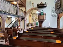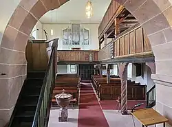 Der Innenraum des Langhauses, der an drei Seiten Emporen hat, ist mit einer Flachdecke überspannt. Zur Kirchenausstattung gehören ein geschnitzter Flügelaltar von 1510, eine Kanzel von 1596 und ein spätgotisches Sakramentshaus.