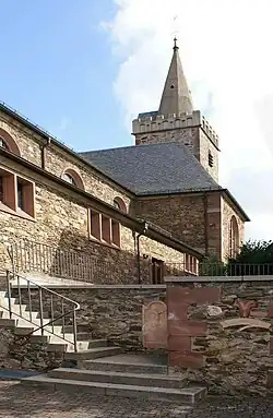 Die ursprüngliche Saalkirche bestand aus einem Langhaus, einem eingezogenen, dreiseitig geschlossenen Chor von 1511/12 und dem quadratischen Chorflankenturm im Süden des Chors von 1449. Der Chorflankenturm, der auch als Wehrturm diente, wurde 1453 aufgestockt, um den Glockenstuhl für die vier Kirchenglocken unterzubringen. Er wurde mit einer Zinne versehen, zwischen der sich ein achtseitiger spitzer Helm erhebt. 1954 wurde diese Saalkirche durch eine Kreuzbasilika ersetzt. Der Chor und der Chorflankenturm blieben mit ihrer Kirchenausstattung erhalten.
