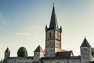 Der gotische 52 Meter hohe Kirchturm hat vier Stockwerke und ein eindrucksvolles Spitzdach. Als Fünfknopfturm mit vier Scharwachttürmen auf den Ecken ist es ein regional typischer Verteidigungsturm des frühen 15. Jahrhunderts.[13]