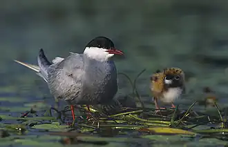 Weißbart-Seeschwalbe (Chlidonias hybrida) mit Küken | ||||||||||||