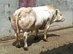 Die belgische Rinderrasse Weißblaue Belgier (WBB) ist vor allem durch eine starke Muskelfülle gekennzeichnet.