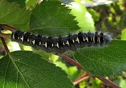 Erwachsene Raupen sind meist bräunlich gefärbt, unregelmäßig behaart und zeigen auf dem Rücken rostrote Warzen sowie dünne weißliche und bläuliche Seitenstreifen. Zuweilen erscheinen schwarzbraune Exemplare, die auf jedem Segment gelbe Flecke oder Ringe aufweisen.