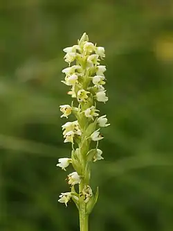 Die Blütezeit reicht von Juni bis August. Der Blütenstand ist schmal-walzenförmig, 4,5 bis 8 Zentimeter lang und dicht mit 20 bis 50 Blüten besetzt. Die Tragblätter sind etwa so lang wie der Fruchtknoten und 6 bis 8 Millimeter lang.[2] Der Fruchtknoten ist gedreht und 2 bis 2,5 Millimeter dick.[2]