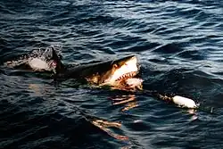 - ↑ R. Aidan Martin, Neil Hammerschlag, Ralph S. Collier, Chris Fallows: Predatory behaviour of white sharks (Carcharodon carcharias) at Seal Island, South Africa. In: Journal of the Marine Biological Association of the United Kingdom. Band 85, 2005, S. 1121–1135 (englisch, Volltext [PDF; 2,1 MB]).