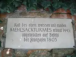 Der Turm wurde 1445 bei der letzten Stadterweiterung als Geschützturm erbaut. Er diente vor allem dazu, das danebenstehende Ulmer Tor und die davorliegende Grimmelschanze abzusichern. Er wurde 1805 im Dritten Koalitionskrieg während der Besetzung durch die französischen Armee auf deren Befehl hin abgebrochen. Diese wollten eigentlich die gesamte Stadtbefestigung schleifen, auf Bitten der Bürgerschaft verschonten sie diese jedoch bis auf fünf Türme. Der Name leitete sich von seinem Aussehen ab. Durch die weiße Kalkung sah er aus wie ein Mehlsack.
