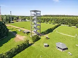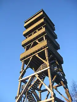 In unmittelbarer Nähe stand seit 1973 ein knapp 30 m hoher Aussichtsturm aus Holz, der eine gute Aussicht in die nähere Umgebung, zur Schneifel, zur Hohen Acht, zum Aremberg, zum Michelsberg, zur Nürburg sowie zum Steling bot. Aufgrund von Sicherheitsmängeln am morschen Holzturm (u. a. an tragenden Teilen und der Treppe) musste dieser im November 2011 abgerissen werden, die Instandhaltungs- und Sanierungskosten von 120.000 Euro waren nicht mehr zu tragen. Im Juli 2013 beschloss der Rat der Gemeinde Hellenthal mit knapper Mehrheit, dass ein neuer Turm gebaut werden soll. Ein Förderverein sollte den Neubau unterstützen.[8] Im November 2014 wurde dieser Turm mit 29,5 m[9] Höhe eröffnet.[10] Er kostete etwa 430.000 Euro; 190.000 davon trug die LEADER-Region. An einer Turmseite soll demnächst eine fast 30 m hohe Kletterwand für Outdoor-Kletterer montiert werden.[11] Neben dem Turm befinden sich eine Grillhütte und ein Spielplatz.